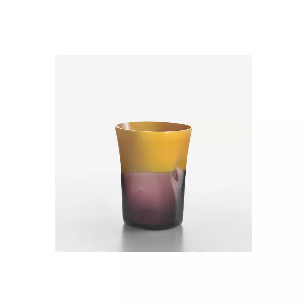 Bicchiere Viola – Girasole Bicchiere in vetro di Murano nella combinazione cromatica Viola – Girasole, realizzato a mano e con l’ausilio di stampi, all’interno dei quali i maestri NasonMoretti soffiano il materiale fuso, una miscela creata seguendo alcune ricette segrete che risalgono alla fondazione della fabbrica. Lo rende ancor più originale l’utilizzo di una tecnica elaborata nel 1951 che prevede uno schiacciamento del bicchiere, il quale si adatta alla mano ed acquisisce un’ergonomia distintiva. Ogni Dandy è, per questo motivo, un pezzo unico. DIMENSIONI: H 11 cm, diametro 9 cm