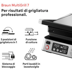 Il Braun MultiGrill 7 CG 7040 è una griglia elettrica versatile con controllo elettronico che offre 3 posizioni di cottura. Con due termostati indipendenti, puoi regolare separatamente la temperatura per cuocere diversi cibi contemporaneamente. Le piastre, facili da pulire e lavabili in lavastoviglie, garantiscono riscaldamento rapido e potenza elevata per risultati professionali. Il design pratico include un vassoio raccogli grasso rimovibile e un sistema di chiusura per facilitare l'immagazzinamento.