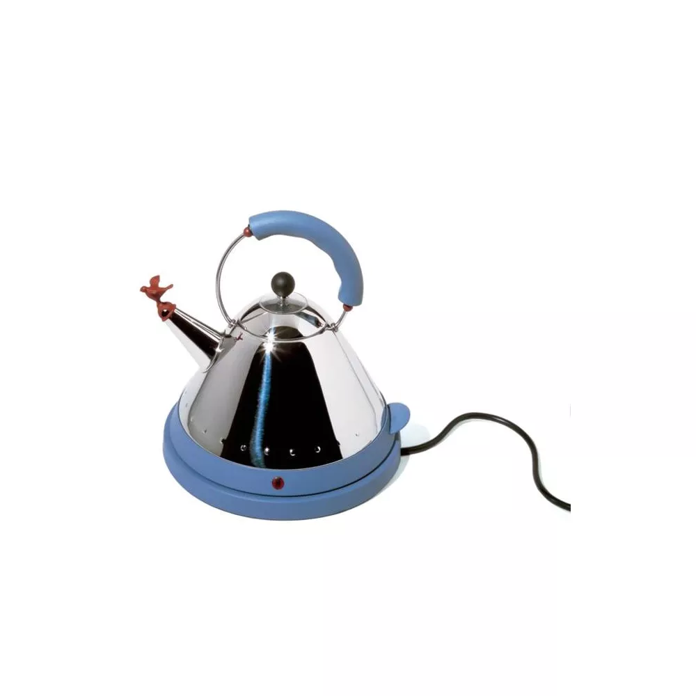 BOLLITORE ELETTRICO, MG - ALESSI Bollitore elettrico cordless in acciaio inossidabile 18/10 lucido con manico e base in resina termoplastica, azzurro. Spina europea. Versione elettrica del celeberrimo bollitore con l’uccellino, un grande successo a partire dal 1985, rappresenta per Alessi il punto di incontro tra il grande design e i metodi di produzione su vasta scala, incontro ricercato con ostinazione da Michael Graves, applicando il suo personale codice visuale che fonde influssi dall’Art Deco alla Pop Art fino al linguaggio dei cartoons. Codice: MG32 Designer Michael Graves Diametro (cm): 25.50 Altezza (cm): 27.00 Content (cl/oz): 150.00