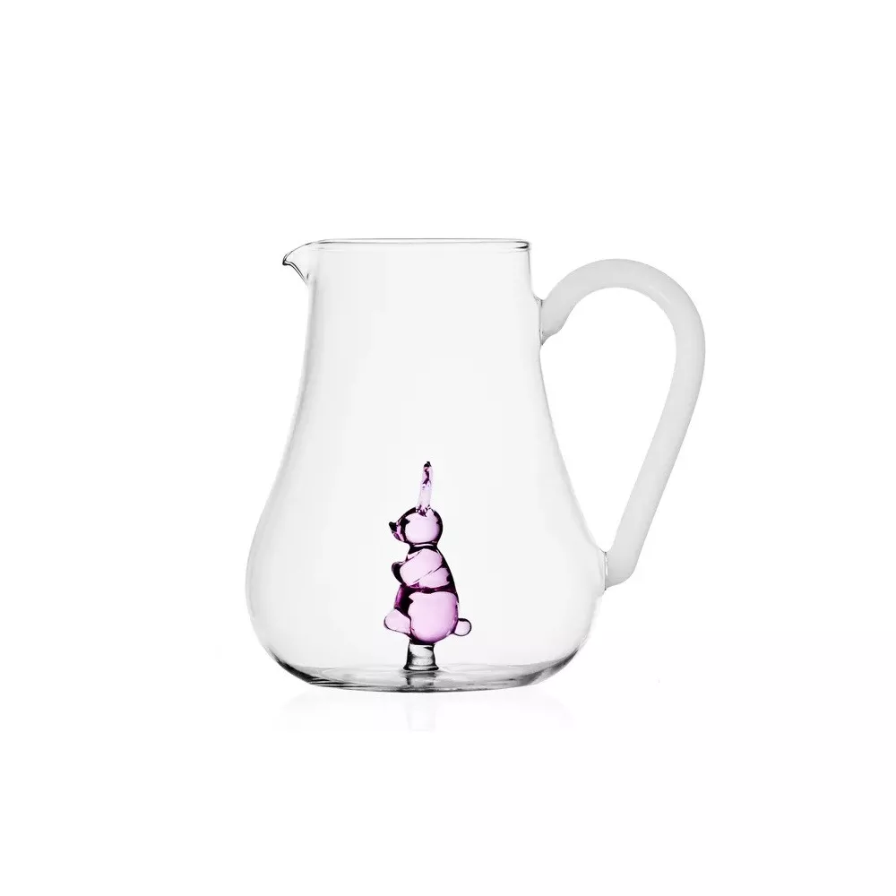 La brocca della collezione Animal Farm di Ichendorf Milano, disegnata da Alessandra Baldereschi, è realizzata in borosilicato trasparente con dettagli in rosa. Ogni pezzo è fatto a mano e modellato a lume, offrendo un design unico e raffinato.