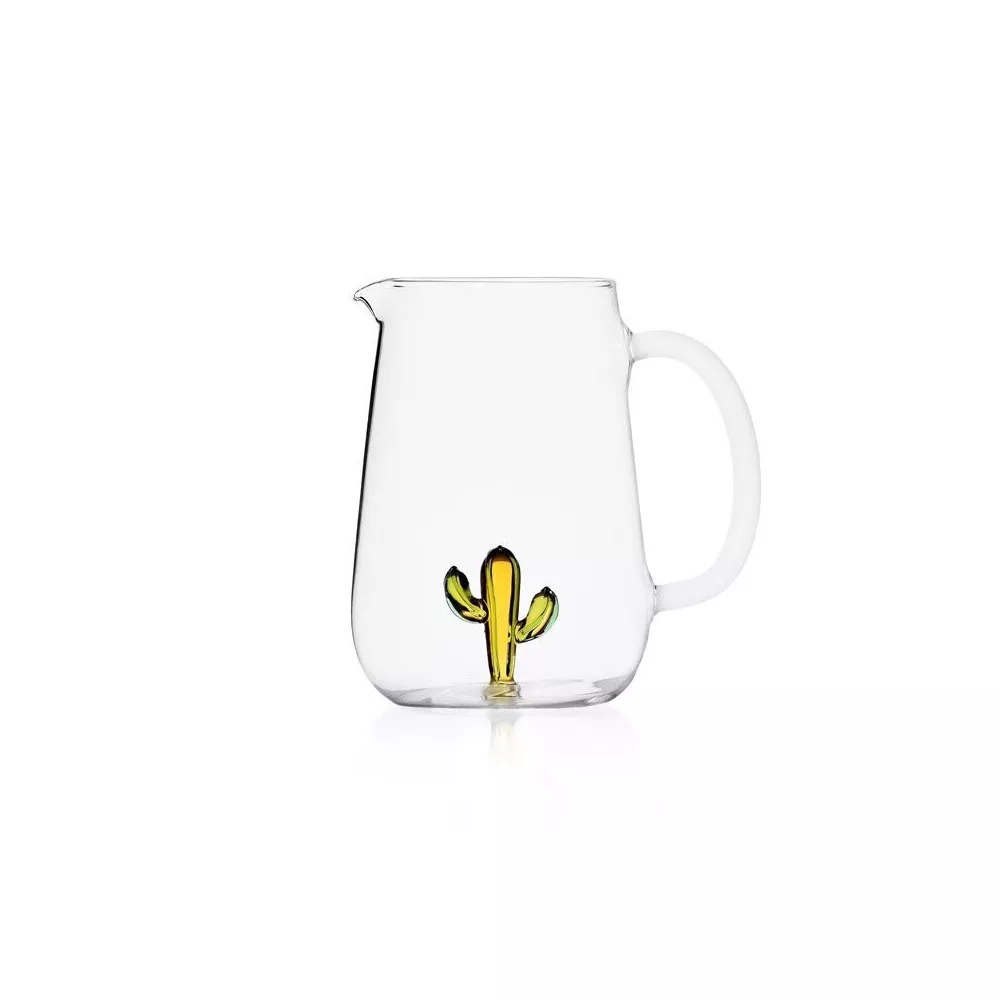 BROCCA CACTUS AMBRA, DESERT PLANTS, 09352109 - ICHENDORF MILANO La brocca, dotata di una maniglia bianco latte, presenta un cactus verde e ambra all'interno del vetro, aggiungendo un dettaglio naturalistico che è sia originale che leggero ed elegante. Questo oggetto è perfetto sia come elemento funzionale su un tavolo da pranzo che come decorazione per la casa. La collezione Desert Plants include una varietà di elementi che richiamano la natura, con cactus colorati che creano un'atmosfera paesaggistica immaginaria sul tavolo. I maestri vetrai hanno creato manualmente la brocca utilizzando vetro soffiato di perfetta trasparenza. Dimensione: H. 18.5 - L. 10 L. 16,0 cm Design by: Alessandra Baldereschi Vetro borosilicato lavorato a lume e realizzato a mano Capacità: 1,75 lt Lavabile in lavastoviglie a basse temperature (consigliati 40°).