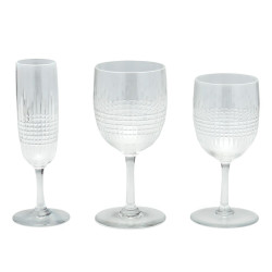 I bicchieri Mille Nuits in cristallo trasparente Baccarat sono caratterizzati da righe che si alternano quasi impercettibili. Percorrendo verticalmente la coppa alta e sottile, questo motivo diffonde con grazia la luce che fluisce dalla sagoma. Il motivo a righe è visibile anche sul piede del bicchiere, dove si irradia a partire dallo stelo. L'elegante frammento di cristallo centrale con taglio a diamante è l'elemento distintivo dei calici Mille Nuits, collocato tra la base della coppa e il piede del bicchiere a unire le due sezioni. Il calice Mille Nuits è disponibile anche sotto forma di flûte da champagne, prodotte in un'ampia gamma di colori vivaci. La collezione Mille Nuits comprende inoltre articoli delle serie Tableware, come bottiglie e piatti, e Home Décor, come lampadari a bracci, lampade e candelabri.
