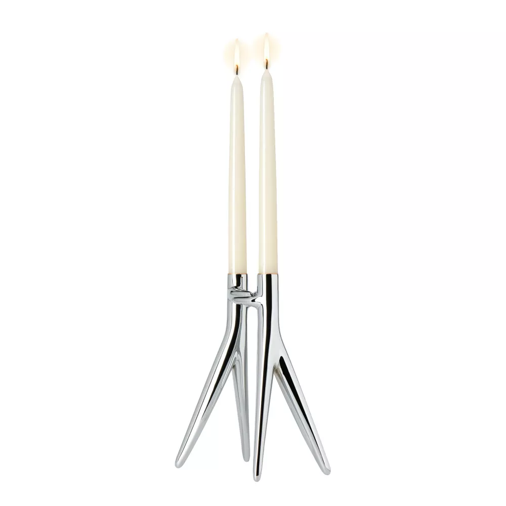 CANDELIERE ABBRACCIAIO, 1955 - KARTELL Abbracciaio è un candelabro realizzato mediante la fusione di due sagome in alluminio che, quando sono posizionate una di fronte all'altra, assumono la forma di un abbraccio affettuoso. Le due strutture che compongono il candelabro sono unite in modo da garantire la stabilità dell'oggetto. Materiale Struttura: Alluminio Galvanizzato Ignifugo: Non Ignifugo Uso: Indoor Dimensioni: H 25 cm, L 20 cm, P 11 cm