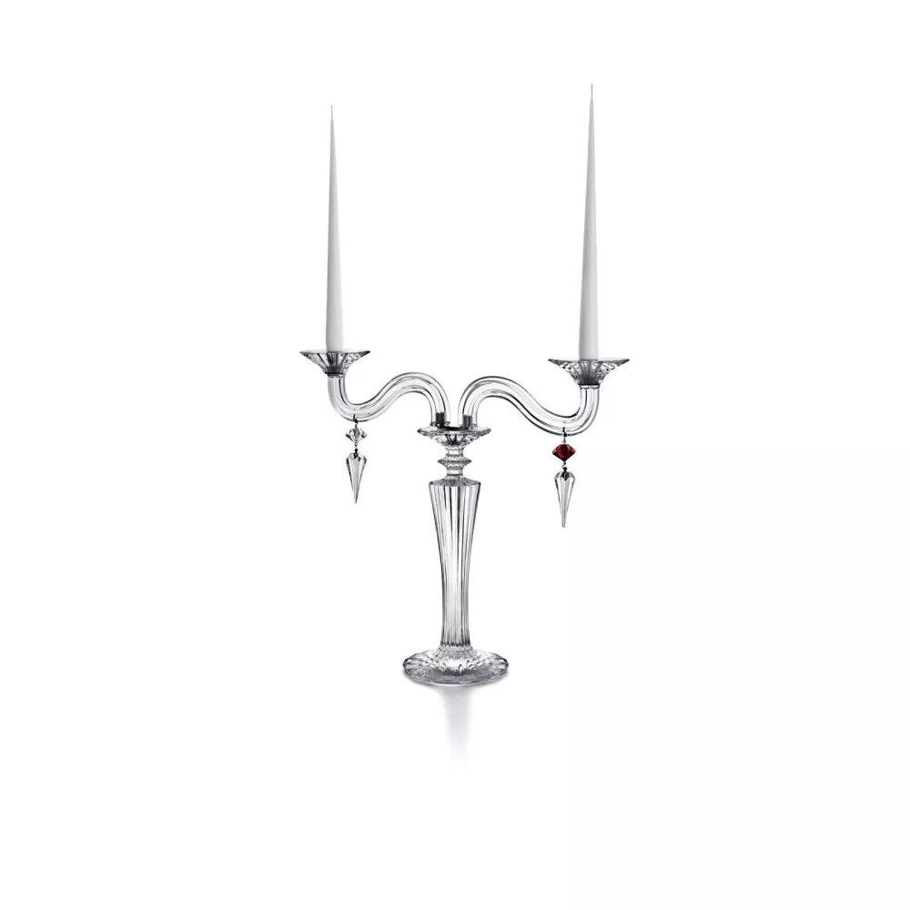 Il candelabro Mille Nuits, dallo spirito barocco, incarna tutto il fascino dell'Oriente. I bracci a taglio inclinato, impreziositi da due riccioli ornamentali in cristallo, risplendono con eleganza. Ogni braccio è decorato con pendenti a forma di freccia, che catturano e riflettono la luce in modo brillante. Le candele sono posizionate in portacandele a forma di narciso in fiore, realizzati in cristallo. Questo sontuoso candelabro Mille Nuits è disponibile in versioni a due, tre o cinque luci, e anche con finitura dorata. Le lanterne antivento, acquistabili separatamente, esaltano ogni tremolio della fiamma, amplificandone la luminosità. Disegnata da Mathias per Baccarat, la collezione Mille Nuits si ispira ai racconti de "Le mille e una notte" e comprende anche lampadari, bicchieri a calice e articoli per la casa.