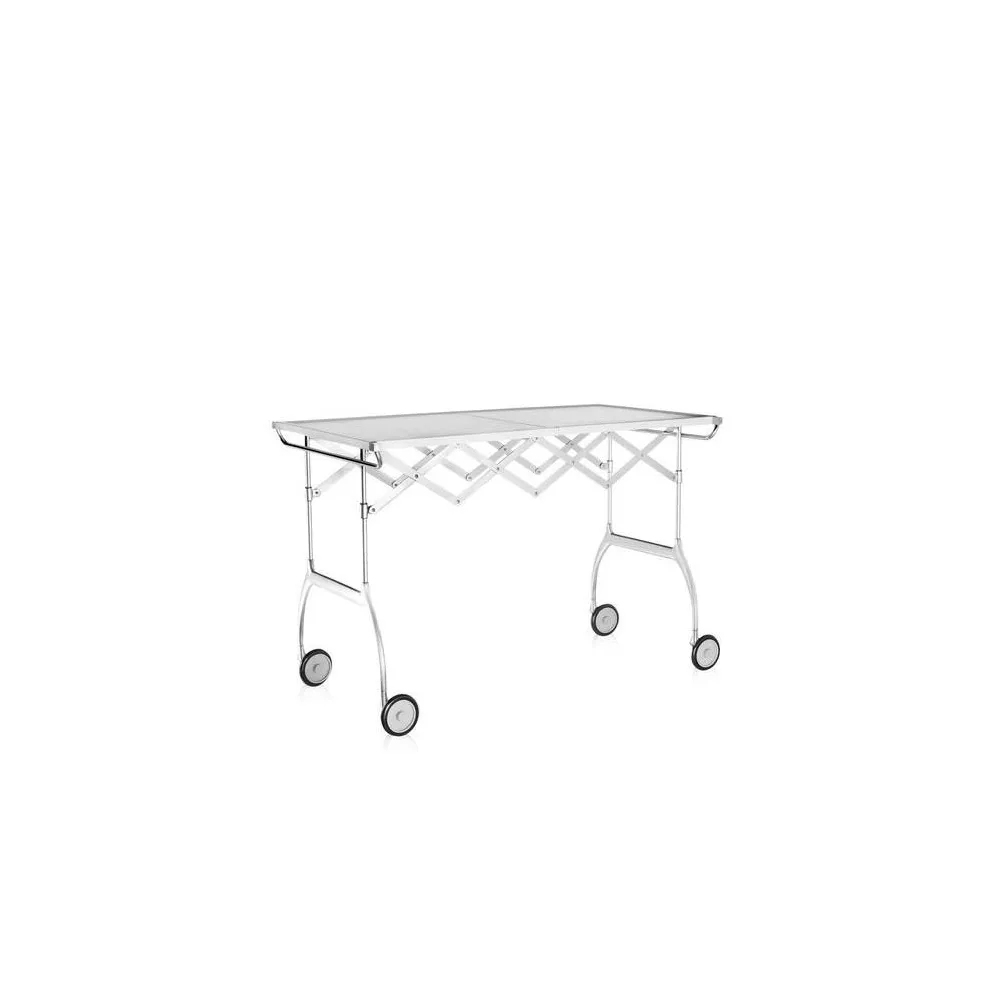 Kartell Carrello Battista bianco opaco by Antonio Citterio con Oliver Löw Battista, oltre ad essere un pratico carrello, caratterizzato dalla riuscita combinazione compositiva tra materiali plastici e metallo, si propone come vero e proprio tavolo allungabile e pieghevole ideale per buffet e aperitivi o come piccolo tavolo da single. É disponibile in più colori: bianco, nero, blu, prugna o panna e nell’elegante versione in poliestere lucido laccato bianco. Struttura: Acciaio cromato Piano: Poliuretano verniciato opaco o laccato in poliestere Dimensioni Larghezza: 100 cm Profondità: 54 cm Altezza: 69 cm Peso unitario: 9.8 kg