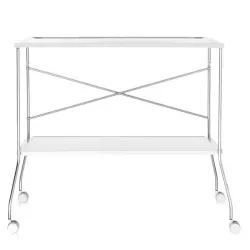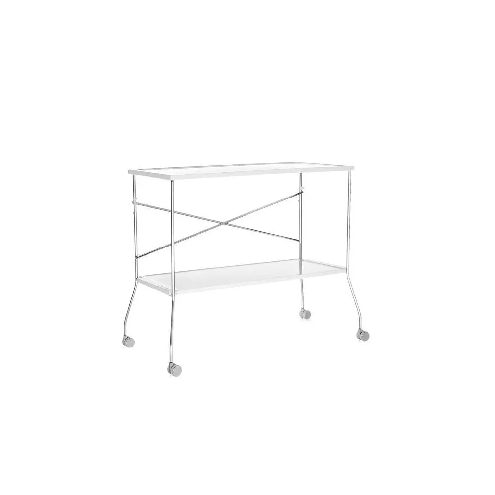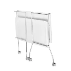 Kartell Carrello Flip bianco by Antonio Citterio con Toan Nguyen Kartell porta la trasparenza anche nel mondo dei carrelli: nasce Flip, un carrello pieghevole che combina il materiale plastico trasparente dei piani con il metallo della struttura. I piani, indipendenti tra loro, sono in polimetilmetacrilato, a sagoma lenticolare, sintesi estrema di funzionalità e ricerca estetica. Flip può essere usato come carrello, ideale per aperitivi e buffet, ma anche come pratico tavolino fronte divano; si piega e, una volta chiuso, occupa uno spazio minimo e può essere riposto con estrema facilità. Materiale Struttura: Acciaio cromato Piano: PMMA Dimensioni Larghezza: 80 cm Profondità: 42 cm Altezza: 72 cm Peso unitario: 10.4 kg