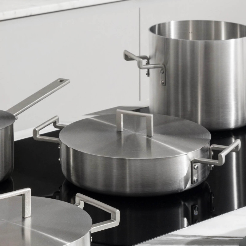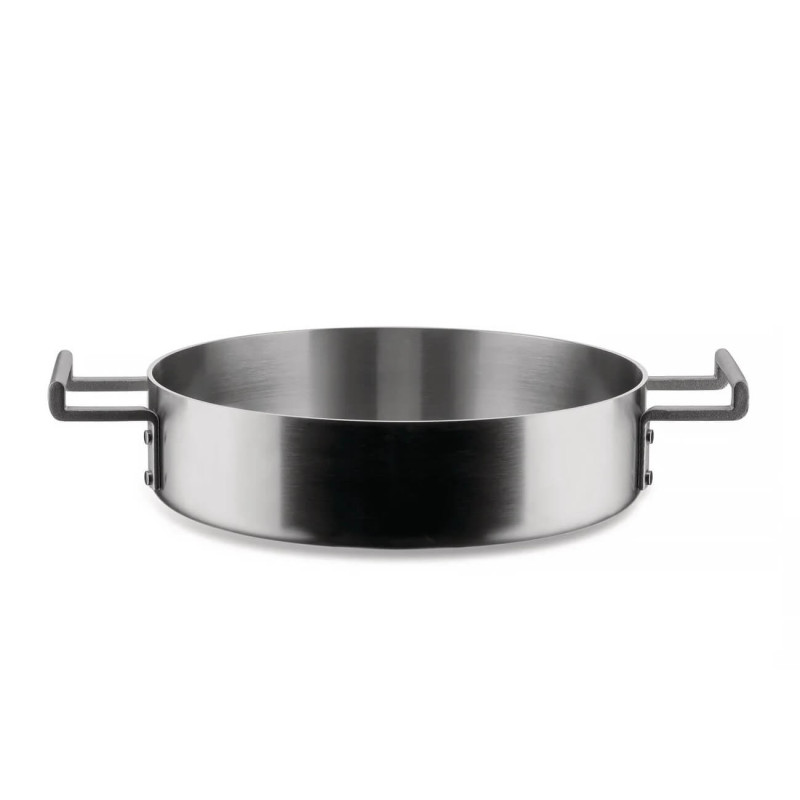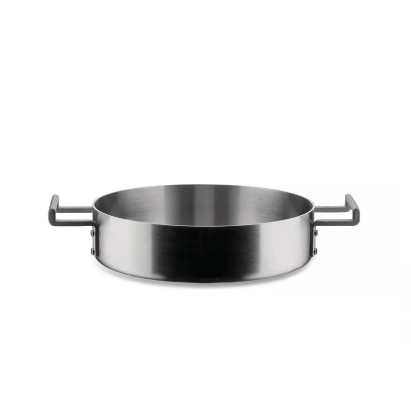 Pentola Convivio Alessi in trilamina satinata (AISI 430, alluminio, acciaio inossidabile 18/10). Manico in acciaio inossidabile con rivestimento PVD. Fondo in acciaio magnetico, adatto anche per i fornelli ad induzione. La casseruola bassa concepita da David Chipperfield con la consulenza di Pietro Leemann incarna appieno nel suo design la filosofia progettuale del premio Pritzker e la cultura culinaria dello chef stellato: una cura meticolosa per i dettagli e una semplicità quasi monastica. Un indispensabile per ogni cucina, disponibile in due diverse dimensioni. Sku: DC102/24 o DC102/28
