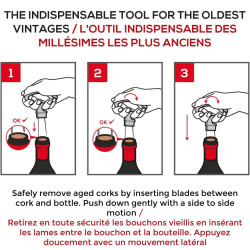 LO STRUMENTO INDISPENSABILE PER I VINTAGE PIÙ ANTICHI Rimuovere i tappi vecchi dalle bottiglie di vino invecchiato può essere un compito difficile anche per i più raffinati collezionisti di vino. Il cavatappi Peugeot Mathus è la soluzione ideale per rimuovere in modo sicuro i tappi invecchiati che sono diventati fragili. Il cavatappi a due punte può anche essere usato per recuperare eventuali tappi spinti giù o rotti nel collo della bottiglia. Basta inserire le due lame tra il tappo e la bottiglia. Rimuovere il tappo tirando con un movimento rotatorio. Ricorda gli apri-vino del XIX secolo, Mathus è fornito con un astuccio protettivo in plastica ABS contemporaneo. Uno strumento indispensabile per tutti gli amanti e conoscitori di vini pregiati. Disponibile in due finiture: alluminio satinato e gunmetal lucidato per un regalo altamente originale.