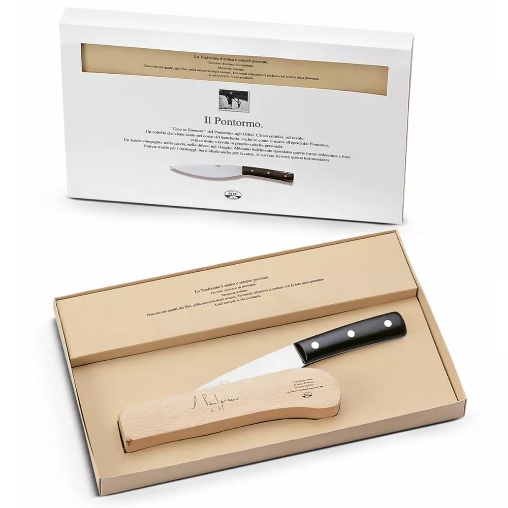 Il coltello Pontormo è un vero capolavoro di versatilità, ideale per molteplici utilizzi in cucina. Riproduce fedelmente il coltello raffigurato nel celebre dipinto La Cena in Emmaus di Pontormo, esposto agli Uffizi di Firenze. Perfetto per il taglio di formaggi, carne e verdure, presenta una lama inclinata che agevola la pressione durante il taglio, un filo curvo per un’azione simile a una mezzaluna e un’ampia superficie per raccogliere gli ingredienti. La lama liscia assicura precisione senza alterare il sapore del cibo. Accompagnato da un ceppo in legno, unisce sicurezza, praticità e design elegante per la tua cucina.