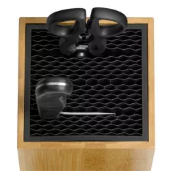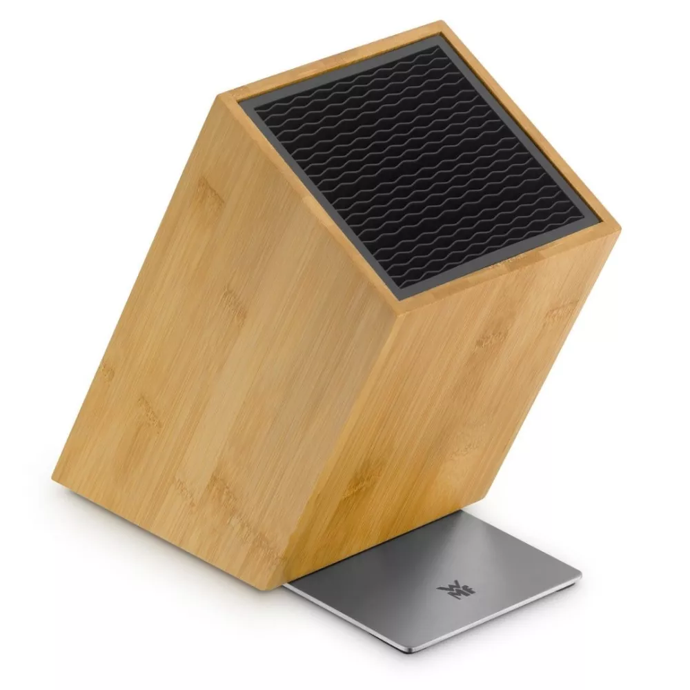 Il blocco portacoltelli FlexTec di WMF rappresenta la soluzione ideale per conservare i coltelli con sicurezza e stile. Realizzato in bambù naturale con base in acciaio inox Cromargan, offre spazio fino a 15 coltelli, con fessure extra per forbici e mannaie cinesi. L’inserto flessibile garantisce stabilità e protezione per ogni tipo di lama, mentre il design moderno e raffinato si adatta perfettamente a qualsiasi cucina, assicurando massima praticità e un tocco di eleganza contemporanea.