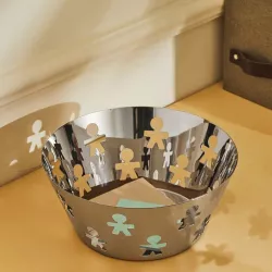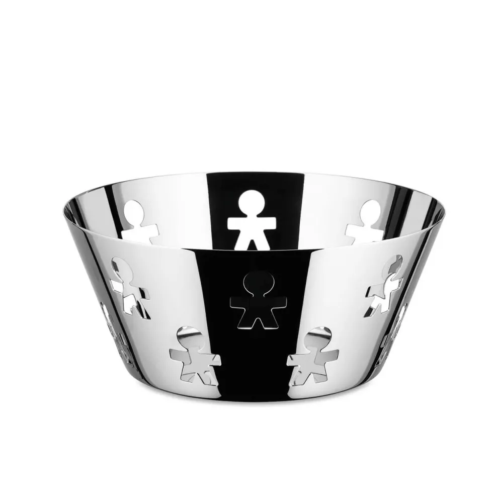 CESTINO TRAFORATO, GIROTONDO AKK - ALESSI Il cestino traforato Girotondo è un'icona nel catalogo Alessi. Il duo creativo King-Kong, Stefano Giovannoni e Guido Venturini, ha ideato il motivo dei piccoli personaggi che si inseguono in cerchio, da cui il nome della collezione: un traforo con un linguaggio immediato ed evocativo, che si trova su oggetti d'uso quotidiano. Materiale: Acciaio Codice articolo: Akk