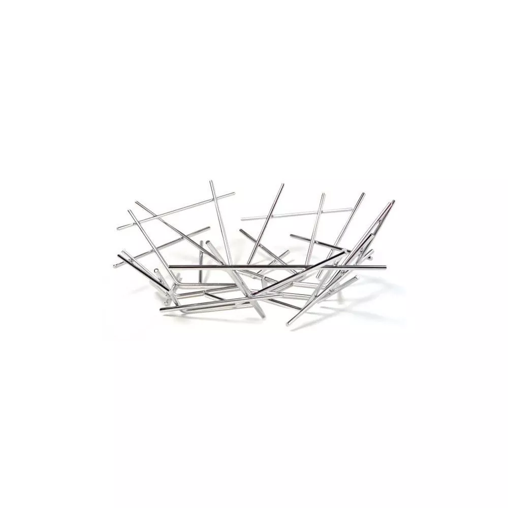 ALESSI BLOW UP Cestino in acciaio inossidabile 18/10, lucido. La novità, la freschezza e la poesia dominano l’approccio estetico-costruttivo ideato dai fratelli Fernando e Humberto Campana per la serie “Blow Up”, in cui la forma degli oggetti è disegnata dal gioco di pieni e vuoti generato dai bastoncini di acciaio assemblati quasi casualmente, tema riconoscibile qui come in molti dei progetti dei geniali brasiliani. codice: FC02 dimensioni: 33 cm x 32 cm - h. 10.5 cm