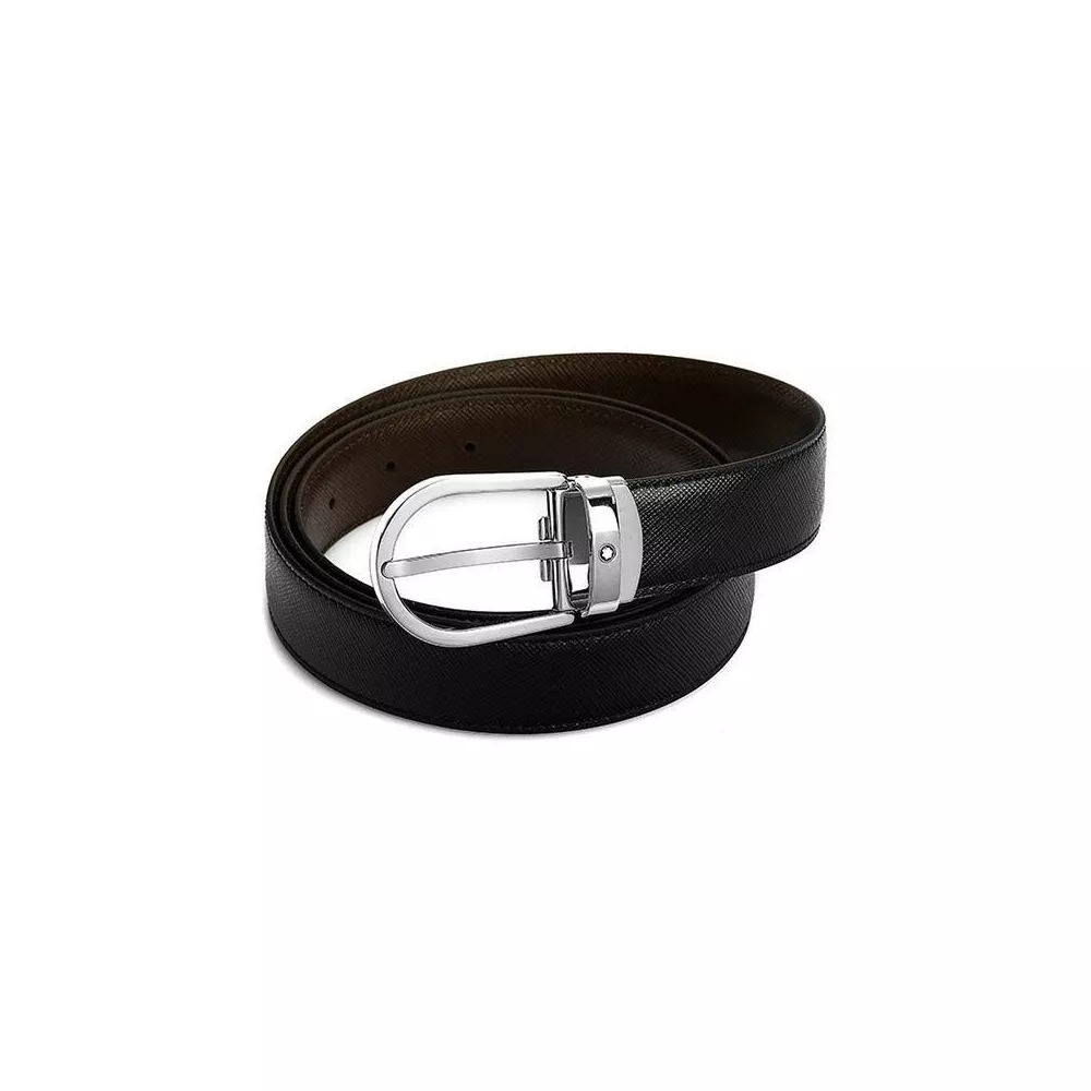 Montblanc Cintura elegante nera/marrone reversibile cut-to-size Codice: 113834 Fibbia ad ardiglione a ferro di cavallo in acciaio pregiato lucido con emblema Montblanc. Cinghia in pelle reversibile nera e marrone stampa Saffiano auto-regolabile. Dimensioni: 120 x 3 cm