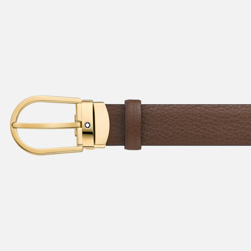 Fibbia ad ardiglione a ferro di cavallo in acciaio pregiato finitura PVD oro chiaro brillante. Cinghia auto-regolabile, 3 cm x 120 cm, in pelle marrone granulata. Materiale: Pelle bovina marrone granulata Fibbia: pratico meccanismo per la regolazione della lunghezza. Forma a ferro di cavallo con finitura oro chiaro. Simbolo Montblanc sul passante in metallo Dimensioni: 120 x 3 x 0,5 cm Codice: MB129423