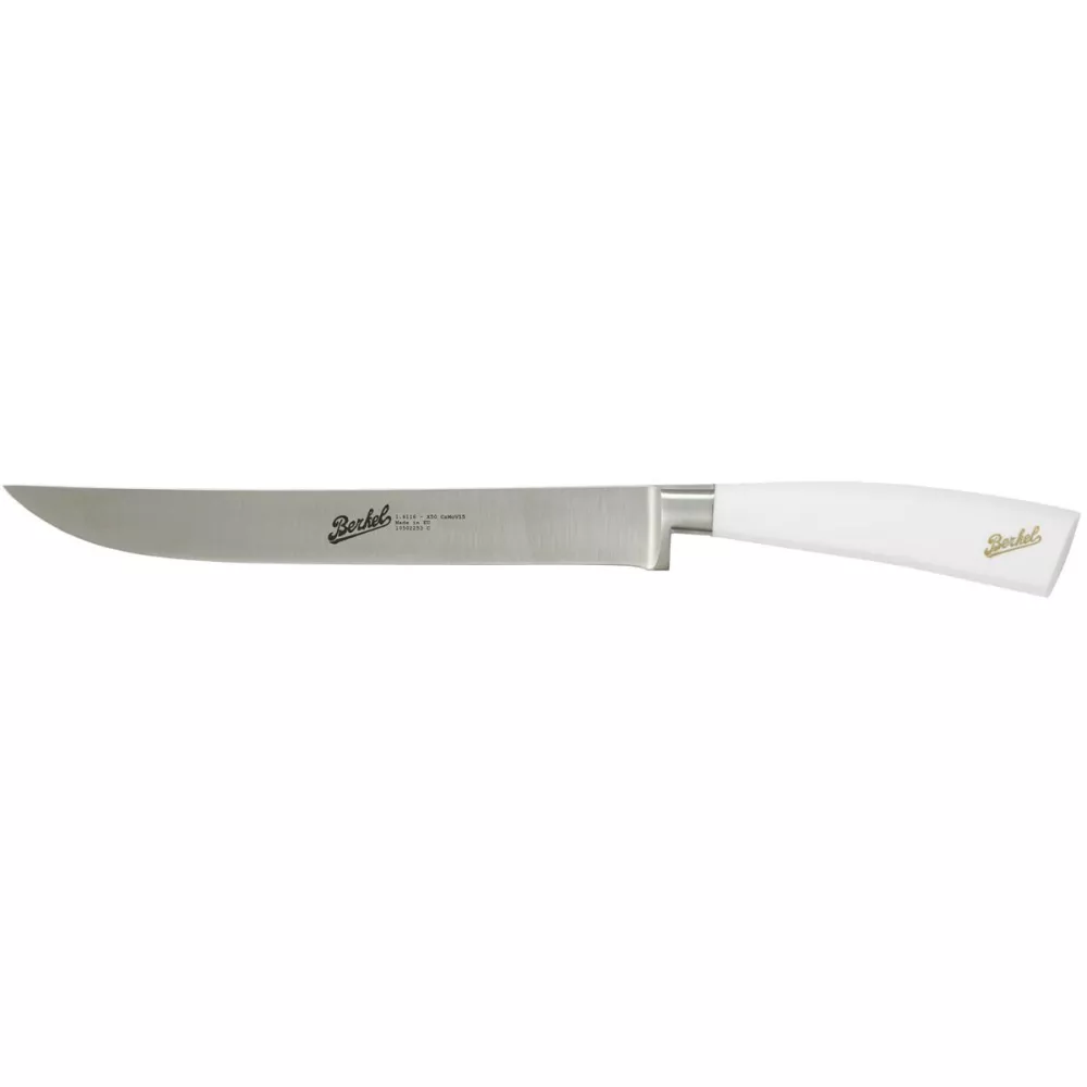 Berkel Elegance Coltello Arrosto 22 cm Il coltello per prodotti da forno Coltello rigido e maneggevole grazie alla lama studiata per permettere di tagliare il tuo arrosto o il roast beef senza nessuno sforzo. Adatto a pezzature di medie e grandi dimensioni. Lama in acciaio 1.4116-X50 Cr Mo V15 di alta qualità al cromo-molibdeno-vanadio Lama realizzata in elettroricalcatura da lastra di 3mm Affilatura: Liscia, senza denti Manicatura stampata in resina acetilica che conferisce un aspetto lucido all’impugnatura Ghiera in acciaio per garantire la massima adesione tra lama e manico e un perfetto bilanciamento del coltello durante l’uso Logo Berkel inciso sulla lama Logo in oro posto sul manico dal design Berkel riconoscibile Sku: KEP1BR22SR