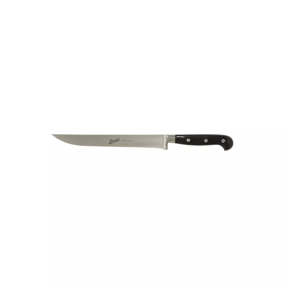 Berkel Adhoc Coltello arrosto 22 cm Coltello rigido e maneggevole. Grazie alla punta ed all'affilatura consente il taglio di arrosti e piatti caldi a base di carne limitando le rotture. Sku: KAD1CA22SRBBL Materiale lama: Forgiato in acciaio inox 1.4116 azotato (durezza fino a 59 hrc) Lunghezza lama: 22 cm Lunghezza e peso totali: 35 cm / 170 gr Affilatura: Liscia, senza denti Impugnatura: Composta da due guancette assemblate con rivetti in alluminio SCOPRI TUTTA LA COLLEZIONE: Coltelli Adhoc | Berkel