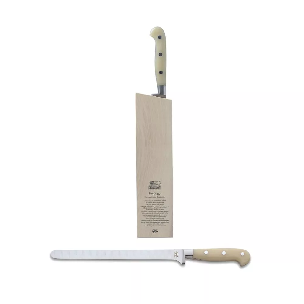Il coltello per salmone Berti con manico bianco è ideale per affettare fette sottili di salmone e altri pesci. La lama lunga e flessibile garantisce tagli precisi e uniformi, perfetti per preparare pesce affumicato o crudo. Il manico ergonomico bianco offre una presa sicura e confortevole. Questo coltello viene fornito con un ceppo, assicurando una conservazione sicura ed elegante. Un accessorio indispensabile per chi ama il pesce e desidera un utensile di alta qualità.