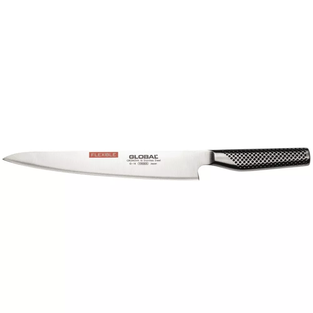Il G-18 di Global è un coltello da filetto professionale con lama flessibile da 24 cm, pensato per lavorazioni di pesci di grandi dimensioni come salmone, trota o merluzzo. Fa parte della gamma G insieme ai modelli G-19 e G-20, tutti caratterizzati da una flessibilità elevata e impugnature robuste per lavori intensi.
