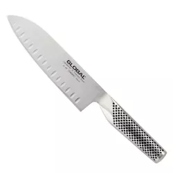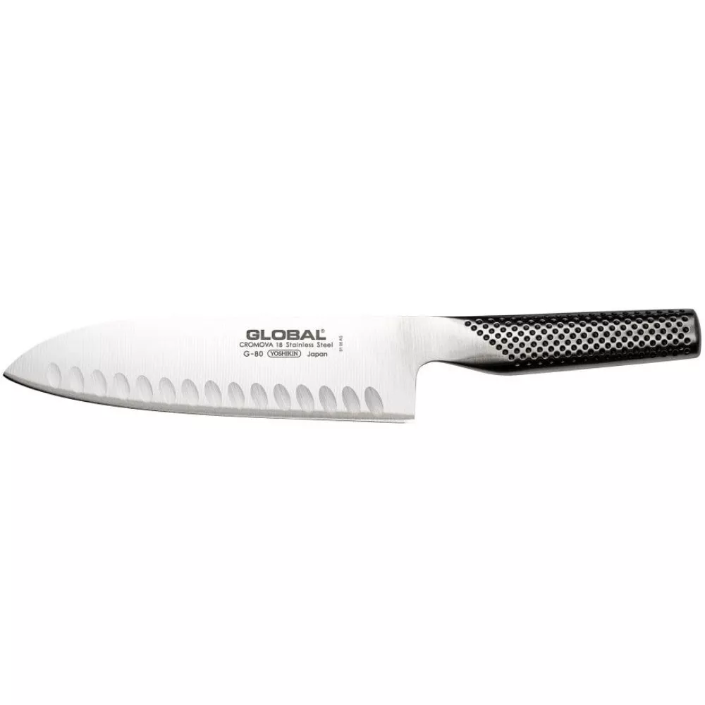 Il coltello Santoku G-80 da 18 cm di Global è uno strumento versatile perfetto per affettare, tritare e sminuzzare. La lama fluttata riduce l'attrito e impedisce agli alimenti di aderire, garantendo tagli precisi e veloci.
