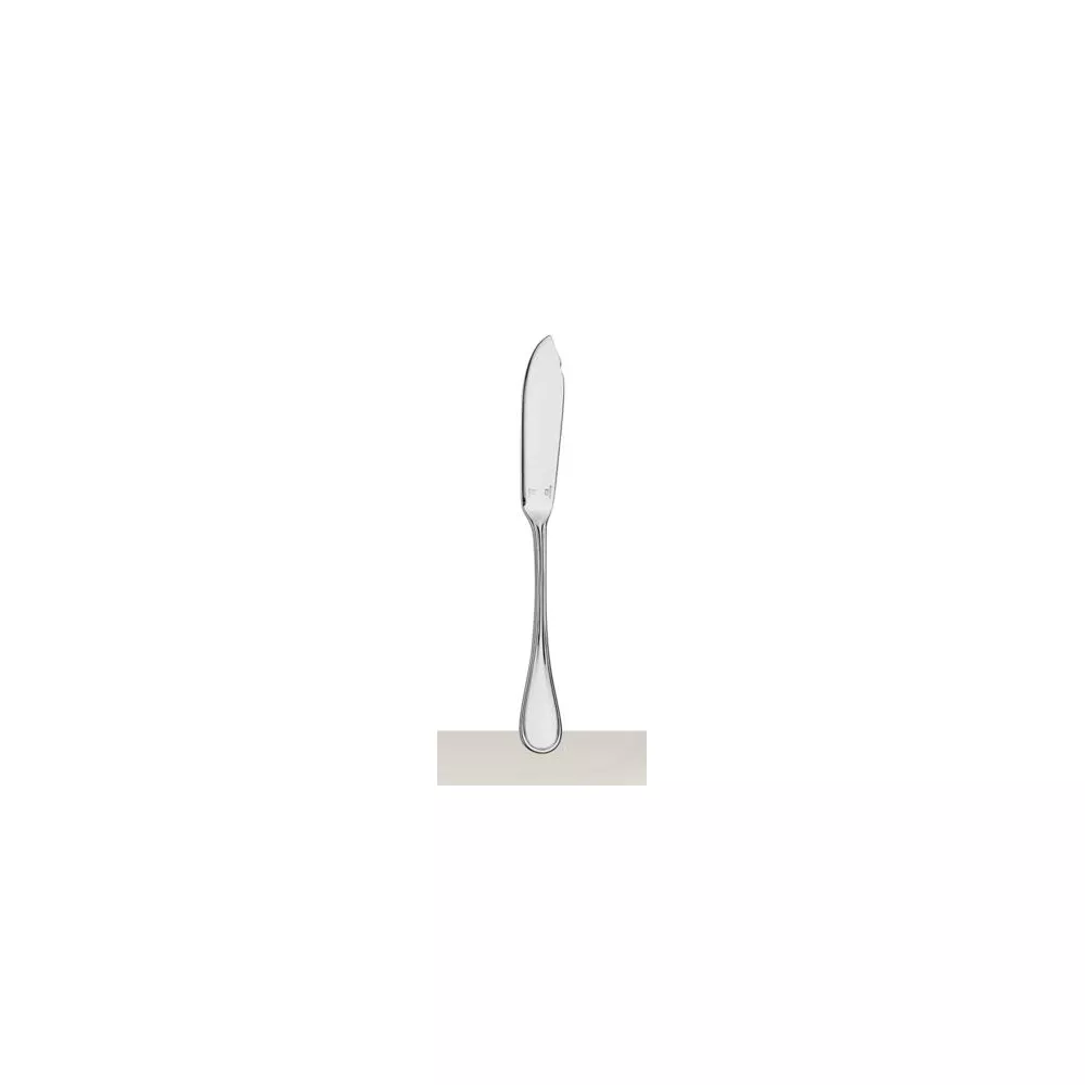 Coltello da pesce Christofle Albi Il coltello da pesce in lega argentata nel modello Albi può essere utilizzato in combinazione con una forchetta per pesce per separare facilmente la carne dalle lische di pesce. La linea Albi, creata nel 1968, trae ispirazione da una città francese situata tra Tolosa e Bordeaux e la sua famosa cattedrale nota per la sua straordinaria architettura, le linee rette pulite e l'unica navata. Lanciata nel 1967, questa posata è stata ispirata dalle linee diritte e pure della cattedrale di Albi, in Francia. MATERIALE • Lega argentata DIMENSIONI •: 20 cm