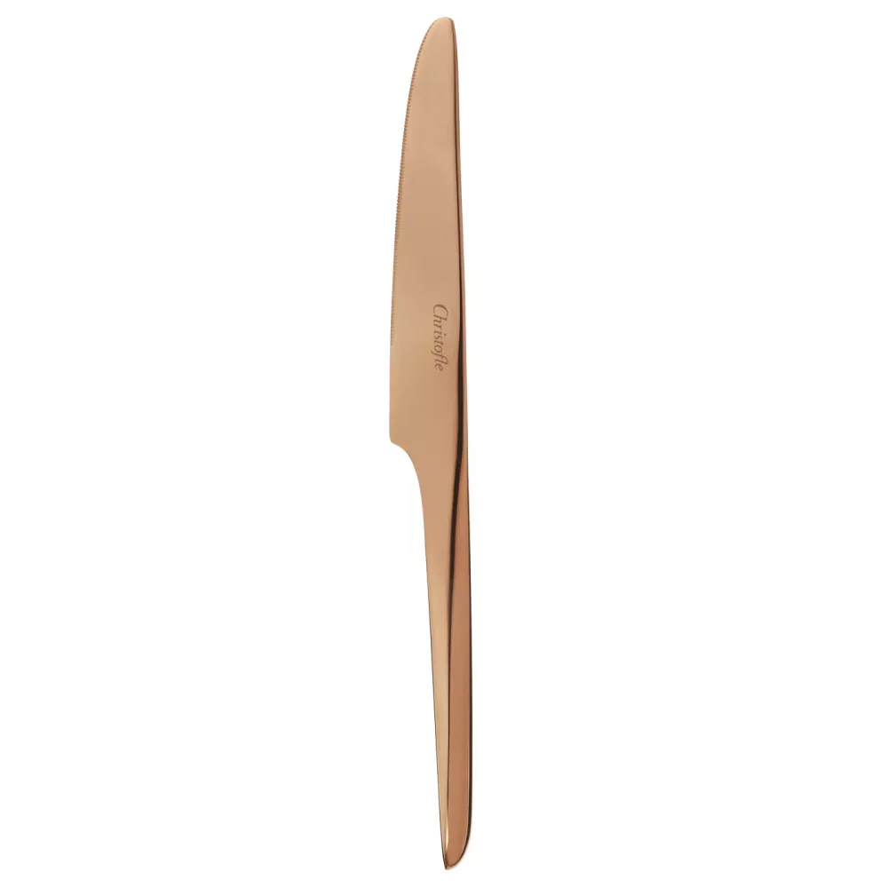 Un raffinato coltello da tavola della collezione L'Âme de Christofle, disponibile nelle finiture oro, rame e nero. Il colore è ottenuto tramite l’applicazione di leghe metalliche colorate, esaltando le linee essenziali del design e conferendo un tocco contemporaneo alle tavole più raffinate. A dieci anni dal lancio della collezione, Christofle introduce nuove tonalità per adattarsi a ogni stile e personalità.