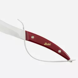 Berkel Sabre a Champagne Rosso Sciabola per stappare vini frizzanti Accessorio di lusso per l'assaggio di qualità di Champagne, Spumante o altri vini frizzanti. Con le sue dimensioni ridotte e affidata a mani esperte, questa sciabola può eseguire un taglio netto per un'apertura scenografica delle bottiglie. Applicare le procedure consigliate. Materiale lama: Forgiato in acciaio inox 1.4116 azotato (durezza fino a 59 hrc) Lunghezza lama: Lama lunga 45 cm Lunghezza e peso totali: 45,5 cm / 430 gr Affilatura: Liscia, senza denti Impugnatura: Ricavata da un unico pezzo e assemblata con speciali stucchi resistenti. Caratteristica protezione per la mano.