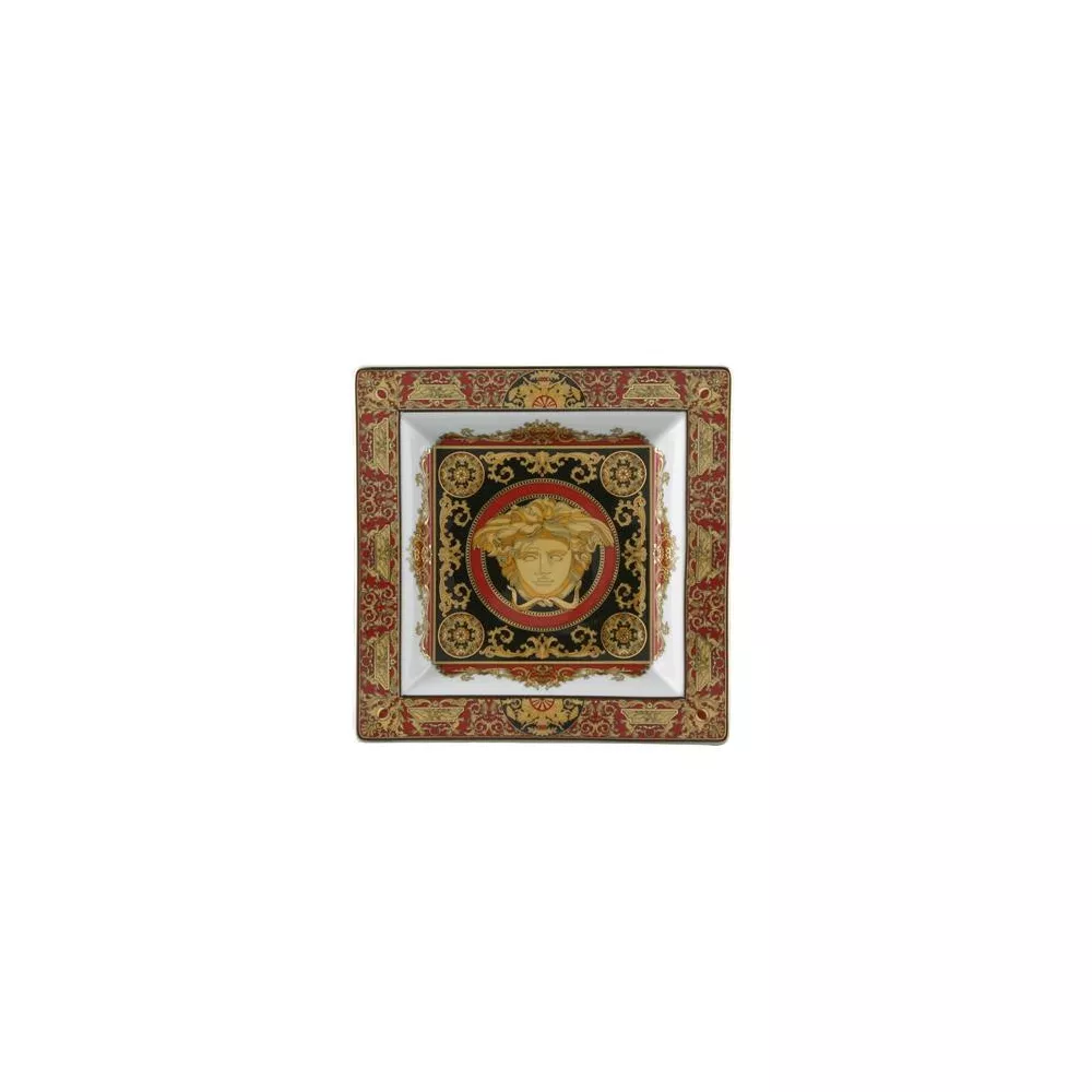 Articolo prodotto in finissima porcellana dal decoro lussuoso dove prevale il colore rosso che caratterizza questo motivo Medusa. I fregi oro conferiscono all'oggetto uno stile particolarmente ricco e sontuoso. Dimensioni: cm 22 x22