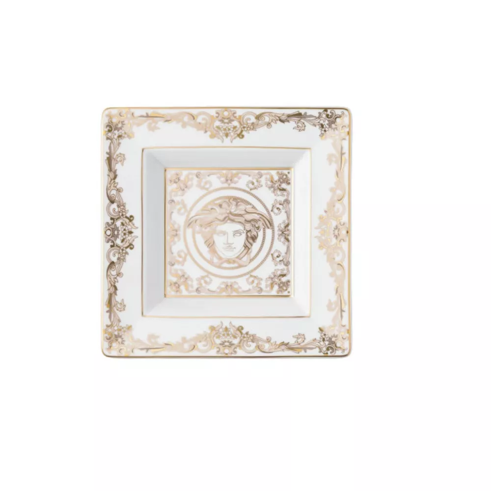 Questo raffinato decoro Versace si chiama Medusa Gala. Viene prodotto utilizzando le migliori porcellane creando uno stile che è meglio descritto come lussuoso e glamour. Il colore più importante di questo oggetto è l'oro. Gli ornamenti sontuosi decorano questo pezzo e lo rendono un "must have" per tutti coloro che sono innamorati di un design opulento. Materiale: porcellana Dimensioni: 14 x 14 cm