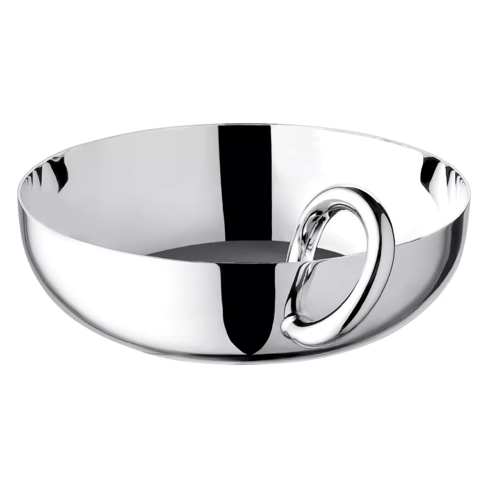 Coppetta della linea Vertigo in lega argentata con manico singolo è perfetto per servire snack come noci, olive o caramelle o potrebbe essere usato come vuotatasche per vari gingilli. Il motivo audace di Vertigo - un anello sottile, asimmetrico e spesso spesso posizionato in modo scherzosamente obliquo - si trova su ogni pezzo della collezione disegnata da Andrée Putman. Diametro : 14 cm