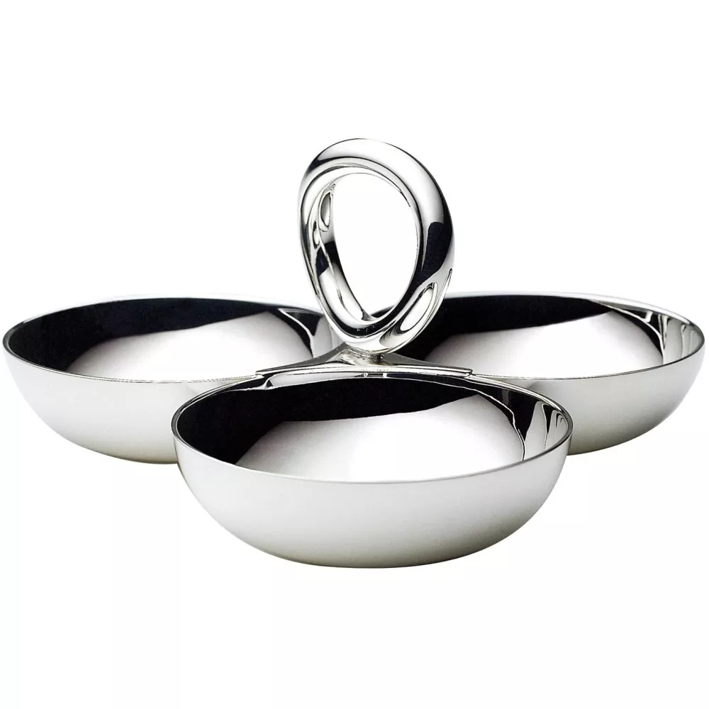 Il piatto da portata Vertigo argentato presenta 3 ciotole di medie dimensioni collegate da una maniglia circolare. Questo piatto è perfetto per servire noci, olive e altri snack leggeri. Il motivo audace di Vertigo di un anello sottile e asimmetrico, posizionato in modo giocoso, si trova su ogni pezzo della collezione disegnata da Andrée Putman.