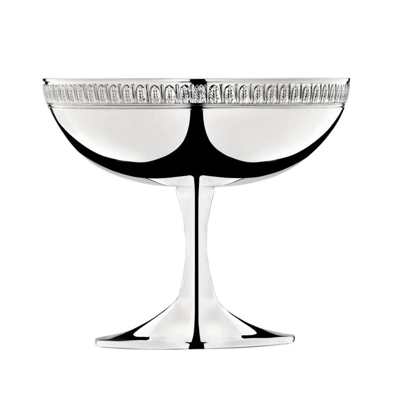 Un'elegante coppa per gelato placcata in argento della collezione Malmaison di Christofle, perfetta per servire dessert con un tocco di raffinatezza. Il bordo è impreziosito dall'iconico fregio di palme e foglie di loto, tipico dello stile Empire, simbolo di simmetria ed eleganza. Il nome della collezione richiama il "Château de la Malmaison", la residenza prediletta di Napoleone Bonaparte e dell'Imperatrice Giuseppina.