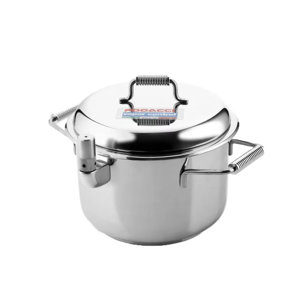 Il sistema brevettato di FOGACCI® vapor control® prevede l'utilizzo di una doppia parete in acciaio inox 18/10 che crea uno spazio vuoto dove si forma il vapore. Grazie ad una speciale valvola, la quantità di vapore e la temperatura all'interno della pentola sono regolate per cuocere gli alimenti in modo delicato e uniforme, senza il rischio di bruciarli. Questo metodo di cottura consente di cuocere gli alimenti senza contatto diretto con la fonte di calore, mantenendo una temperatura costante che non supera mai i 105°C. In questo modo, gli alimenti sono preservati dalle alterazioni del calore e si conservano inalterati i sapori, i principi nutrizionali e i valori nutrizionali. FOGACCI® vapor control® è la scelta ideale per una cucina sana e gustosa, dove la qualità degli alimenti è sempre al primo posto.