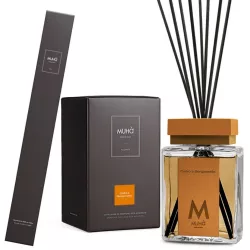 La linea Bastoncino di Muhà incarna l’eleganza del design italiano con dettagli artigianali di pregio. La bottiglia in vetro con collo in zama e l’etichetta in ecopelle coniugano raffinatezza e sostenibilità. I bastoncini in fibra diffondono gradualmente una fragranza agrumata e luminosa, capace di portare nelle stanze energia e armonia.
