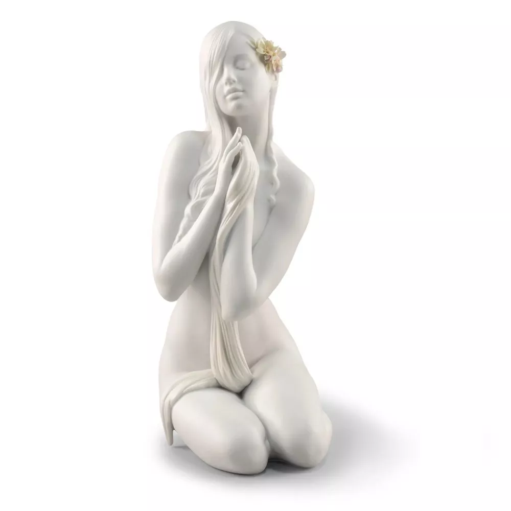 La pace interiore, rappresenta una donna in un momento di calma, prendendosi cura di se stessa. La lavorazione della porcellana bianca opaca trasmette la naturalezza e la purezza del materiale e a sua volta, esalta la ricchezza scultorea del pezzo, 5 fiori bianchi, decorati in toni pastello, che lei mostra tra i capelli, sono stati elaborati, petalo per petalo. Questo articolo include garanzia Peso: 1.35 kg Finitura: Mate Dimensioni: Altezza (cm): 31 Larghezza (cm): 13 Lunghezza (cm): 19