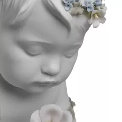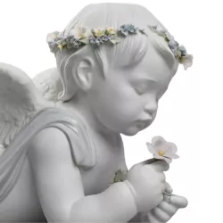 La figurina Mio amato angelo di Lladro' esprime dolcezza contemplativa e raffinatezza scultorea attraverso la rappresentazione di un angelo sdraiato, simbolo di protezione e serenita. Realizzata in porcellana bianca opaca, e arricchita da delicati tocchi di colore nei fiori blu e nel tessuto che avvolge la figura. Un’opera che unisce realismo e idealizzazione, distinguendosi per la cura estrema dei dettagli e per una modellazione armoniosa di grande impatto emotivo.