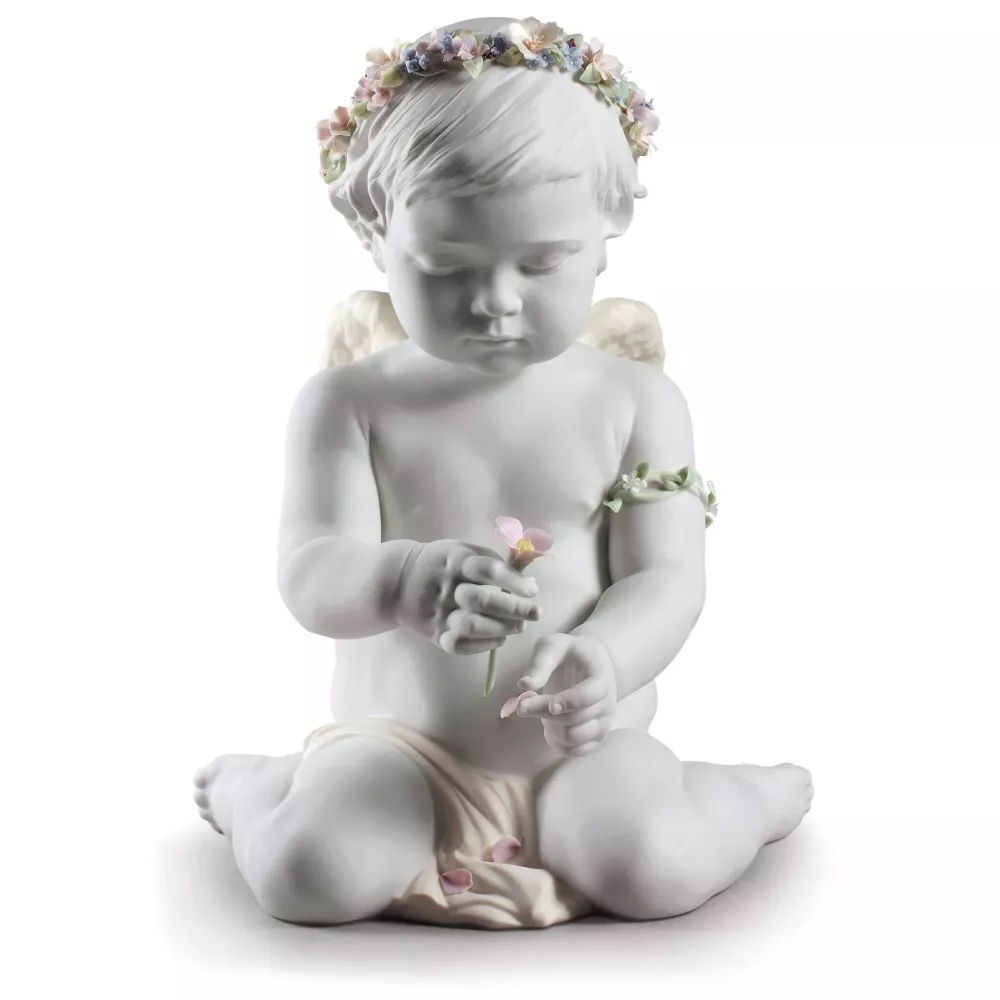 CHERUBINO DELL AMORE, LLADRO Figura in porcellana bianca opaca di serie limitata di Angelo decorata con smalti dai toni morbidi con bracciale e una ghirlanda composta da 19 fiori e 55 foglie. Dimensioni: A 36 cm x L 28 cm x L 32 cm Scultore: Ernest Massuet Unitá Serie limitata: 1500 SKU 1009117