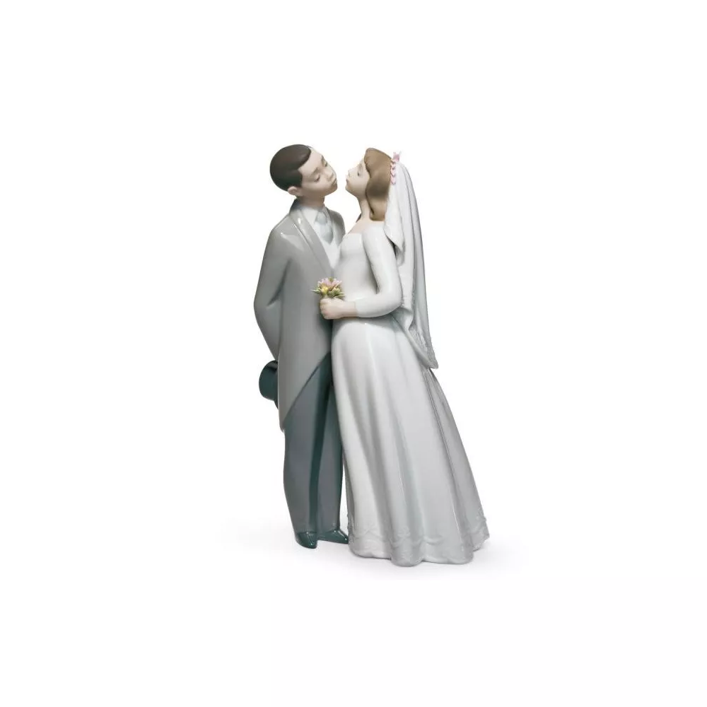Coppia di statue in porcellana, decorata con colori pastello, raffiguranti due novelli sposi nell'atto di suggellare i loro voti con il bacio che simboleggia l'unione eterna.