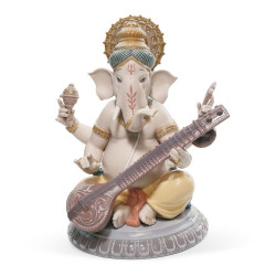 Questo Lord Ganesha tiene una grande chitarra indiana chiamata veena. Inoltre, il pezzo è pieno di altri attributi dell'iconografia di Ganesha come la gada (o macis), il paasha (cappio o corda) e la zanna spezzata. Tutti hanno il loro simbolismo spiegato sugli "avatar" o storie tradizionali su Ganesha. Designer: Raul Rubio, Release year 2007 Dimensioni: 23 x 19 cm