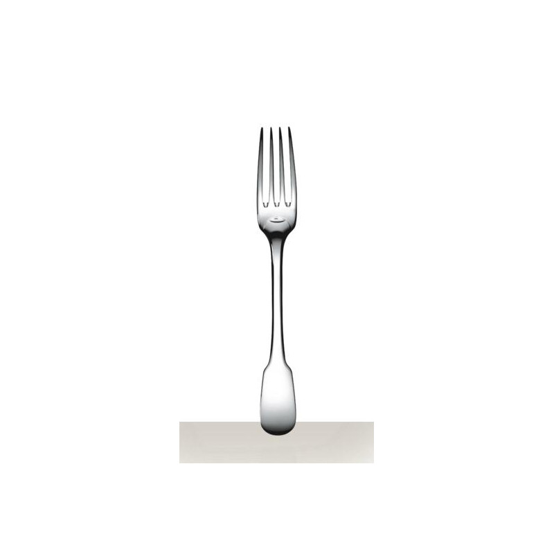 Christofle Cluny Forchetta tavola Una forchetta da pranzo standard in lega argentata nel modello Cluny La collezione Cluny, semplice ed elegante, che risale al primo catalogo di Christofle nel 1862 quando era conosciuta come Uni, è stata leggermente ridisegnata nel 1964. Conserva ancora un aspetto generale di Louis XIII ed è una tela bianca per la personalizzazione. MATERIALE • lega argentata DIMENSIONI •: 21 cm