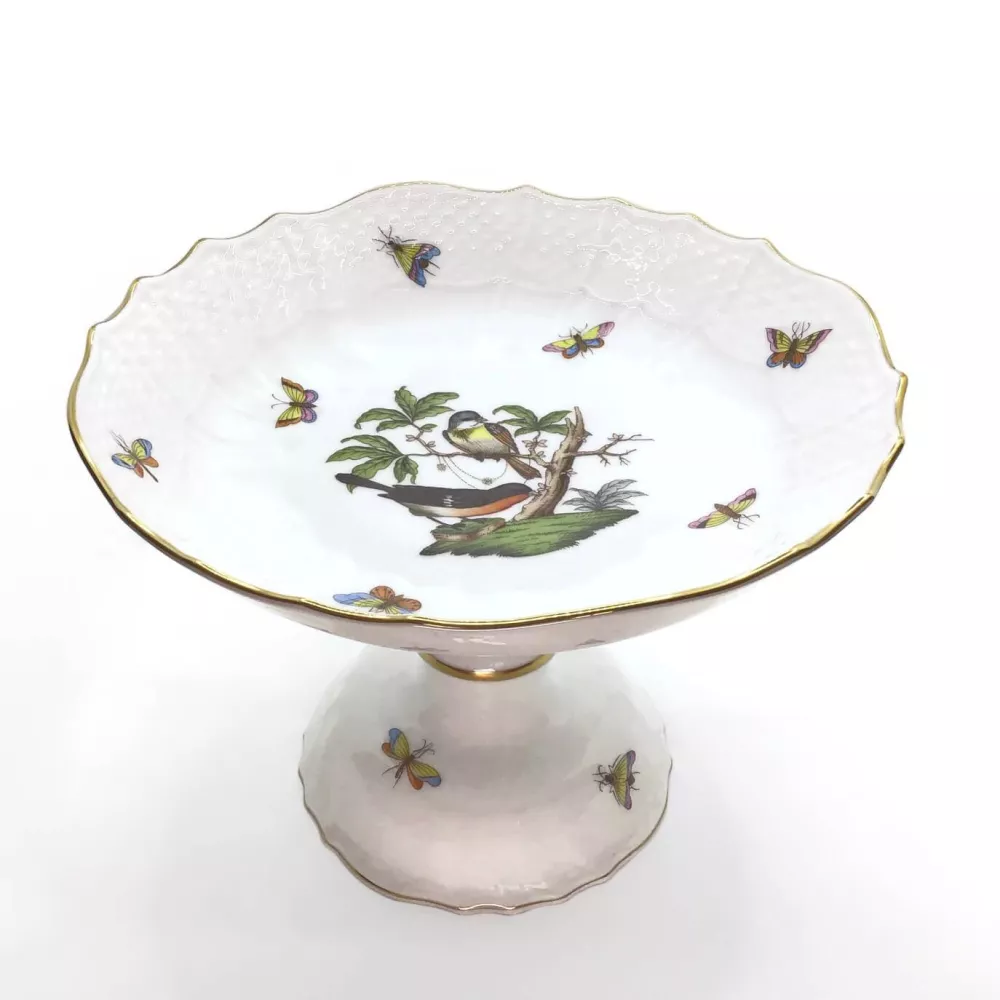 Rothschild Birds, uno dei decori Herend più conosciuti, prende il nome dall'importante famiglia baronale dei Rothschild ed ha come protagonisti due uccelli (sono raffigurate dodici diverse specie di uccelli appoggiati ad un ramo stilizzato). Il decoro si ispira a un racconto del XIX secolo sulla baronessa Rothschild, che perse dei preziosi di perle nel giardino della sua residenza viennese. Venne ritrovata diversi giorni dopo dal suo giardiniere che notò due uccellini giocarci su di un albero. Alzata per frutta 20 x h 15,5 cm Materiale: porcellana con decorazioni in oro Codice: 1313 Si consiglia il lavaggio a mano. Mai mettere nel microonde un articolo con finiture oro o platino.
