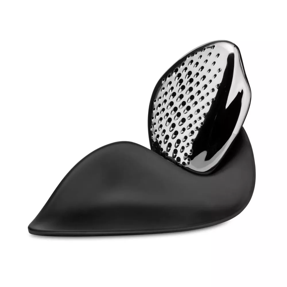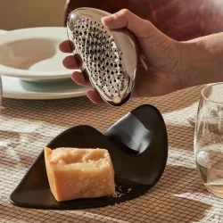 “Forma” è una grattugia disegnata per adattarsi al profilo del palmo, facile e piacevole da impugnare. Una forma organica ispirata ai ciottoli levigati dall’acqua e dal vento, plasmata in acciaio inossidabile attraverso un complesso processo produttivo. Il formaggio, grattugiato sulla superficie dai fori asimmetrici, viene sparso sul piatto in maniera irregolare e crea una trama originale. La grattugia poggia una base con la quale crea un unico pezzo scultoreo. Grattugia in acciaio inox 18/10, base in melamina Dimensioni: h 14 x L 20 cm Sku: ZH03