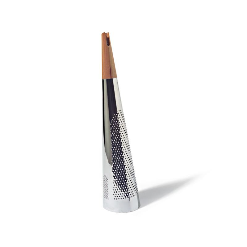 Alessi Grattugia gigante Todo Codice: RS08 Grattugia gigante per formaggio e noce moscata in acciaio e legno. Dovete sapere che Sapper, uno dei designer con i quali lavoriamo da più lungo tempo, l’autore di alcuni dei nostri oggetti più innovativi, in casa sua ha il compito di grattugiare il formaggio per tutta la famiglia. Ispirato dunque da una lunga pratica personale sul tema, questa volta ha disegnato una novità che riempirà di soddisfazione i grandi consumatori di formaggio grattugiato. “Todo” consente infatti, grazie alla eccezionale corsa offerta dal lungo corpo troncoconico, di produrre con una sola passata la quantità di formaggio necessaria per ogni singolo piatto. Larghezza (cm): 10.00 Altezza (cm): 46.00 Lunghezza (cm): 10.00