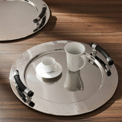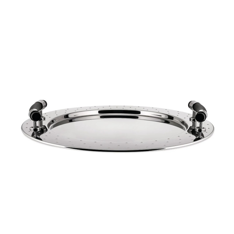 Alessi Vassoio rotondo con manici Codice: MGVASS Designer Michael Graves Vassoio rotondo in acciaio inossidabile 18/10 lucido con manici in PA, nero. Lo stile riprende i particolari decorativi della famiglia del celebre bollitore con l’uccellino del 1985. Diametro (cm): 48.00