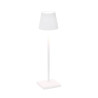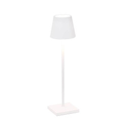 LAMPADA DA TAVOLO, POLDINA MICRO, ZAFFERANO SRL Lampada da tavolo ricaricabile, base di ricarica a contatto inclusa, corpo realizzato in alluminio verniciato, diffusore in policarbonato e illuminazione a LED. Il pulsante di accensione è touch ed è posto sulla sommità del diffusore; tramite lo stesso pulsante si può regolare la temperatura di colore della luce: 2200, 2700 o 3000K e l’intensità del flusso luminoso. La lampada ha inoltre un grado di protezione IP65 che rende la lampada "poldina" adatta sia all’uso interno che esterno. Alimentatore non incluso nella versione micro. Pacco batteria al litio ricaricabile e sostituibile (circa 3-4 hr per la ricarica a 1A) Corpo in alluminio pressofuso, diffusore in policarbonato Adatta all'uso da esterno (IP65) La durata della batteria è garantita per 7/8 ore alla massima potenza Diametro: 7 cm; H 27,5 cm; Base: 7x7 cm