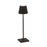 LAMPADA DA TAVOLO, POLDINA MICRO, ZAFFERANO SRL Lampada da tavolo ricaricabile, base di ricarica a contatto inclusa, corpo realizzato in alluminio verniciato, diffusore in policarbonato e illuminazione a LED. Il pulsante di accensione è touch ed è posto sulla sommità del diffusore; tramite lo stesso pulsante si può regolare la temperatura di colore della luce: 2200, 2700 o 3000K e l’intensità del flusso luminoso. La lampada ha inoltre un grado di protezione IP65 che rende la lampada "poldina" adatta sia all’uso interno che esterno. Alimentatore non incluso nella versione micro. Pacco batteria al litio ricaricabile e sostituibile (circa 3-4 hr per la ricarica a 1A) Corpo in alluminio pressofuso, diffusore in policarbonato Adatta all'uso da esterno (IP65) La durata della batteria è garantita per 7/8 ore alla massima potenza Diametro: 7 cm; H 27,5 cm; Base: 7x7 cm