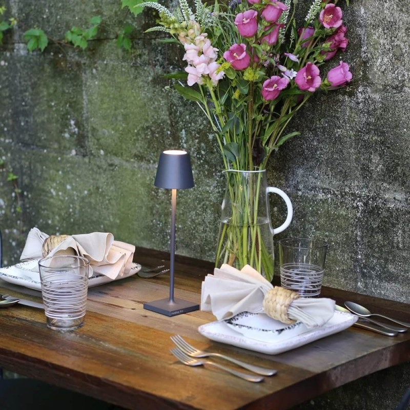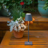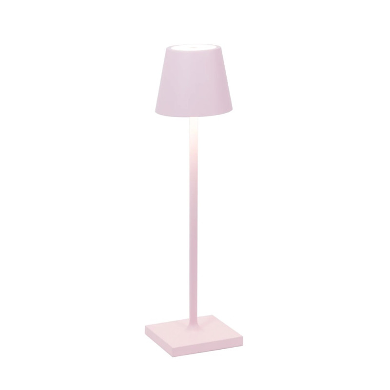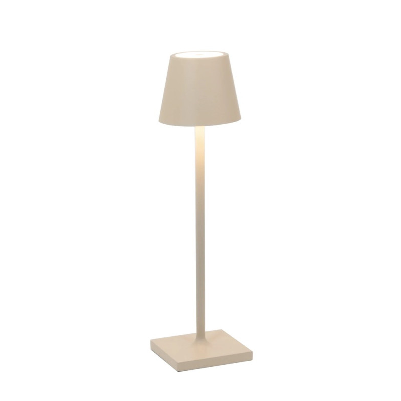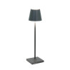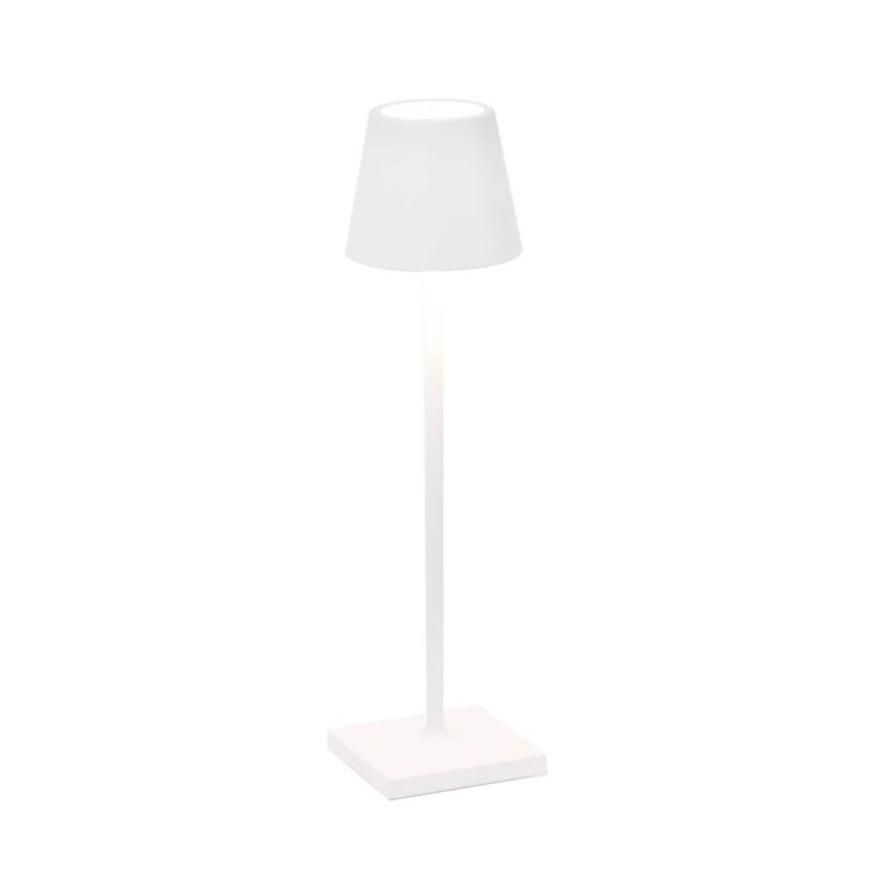 LAMPADA DA TAVOLO, POLDINA MICRO, ZAFFERANO SRL Lampada da tavolo ricaricabile, base di ricarica a contatto inclusa, corpo realizzato in alluminio verniciato, diffusore in policarbonato e illuminazione a LED. Il pulsante di accensione è touch ed è posto sulla sommità del diffusore; tramite lo stesso pulsante si può regolare la temperatura di colore della luce: 2200, 2700 o 3000K e l’intensità del flusso luminoso. La lampada ha inoltre un grado di protezione IP65 che rende la lampada "poldina" adatta sia all’uso interno che esterno. Alimentatore non incluso nella versione micro. Pacco batteria al litio ricaricabile e sostituibile (circa 3-4 hr per la ricarica a 1A) Corpo in alluminio pressofuso, diffusore in policarbonato Adatta all'uso da esterno (IP65) La durata della batteria è garantita per 7/8 ore alla massima potenza Diametro: 7 cm; H 27,5 cm; Base: 7x7 cm