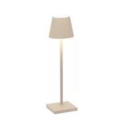 LAMPADA DA TAVOLO, POLDINA MICRO, ZAFFERANO SRL Lampada da tavolo ricaricabile, base di ricarica a contatto inclusa, corpo realizzato in alluminio verniciato, diffusore in policarbonato e illuminazione a LED. Il pulsante di accensione è touch ed è posto sulla sommità del diffusore; tramite lo stesso pulsante si può regolare la temperatura di colore della luce: 2200, 2700 o 3000K e l’intensità del flusso luminoso. La lampada ha inoltre un grado di protezione IP65 che rende la lampada "poldina" adatta sia all’uso interno che esterno. Alimentatore non incluso nella versione micro. Pacco batteria al litio ricaricabile e sostituibile (circa 3-4 hr per la ricarica a 1A) Corpo in alluminio pressofuso, diffusore in policarbonato Adatta all'uso da esterno (IP65) La durata della batteria è garantita per 7/8 ore alla massima potenza Diametro: 7 cm; H 27,5 cm; Base: 7x7 cm