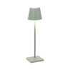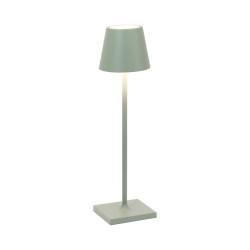LAMPADA DA TAVOLO, POLDINA MICRO, ZAFFERANO SRL Lampada da tavolo ricaricabile, base di ricarica a contatto inclusa, corpo realizzato in alluminio verniciato, diffusore in policarbonato e illuminazione a LED. Il pulsante di accensione è touch ed è posto sulla sommità del diffusore; tramite lo stesso pulsante si può regolare la temperatura di colore della luce: 2200, 2700 o 3000K e l’intensità del flusso luminoso. La lampada ha inoltre un grado di protezione IP65 che rende la lampada "poldina" adatta sia all’uso interno che esterno. Alimentatore non incluso nella versione micro. Pacco batteria al litio ricaricabile e sostituibile (circa 3-4 hr per la ricarica a 1A) Corpo in alluminio pressofuso, diffusore in policarbonato Adatta all'uso da esterno (IP65) La durata della batteria è garantita per 7/8 ore alla massima potenza Diametro: 7 cm; H 27,5 cm; Base: 7x7 cm