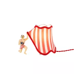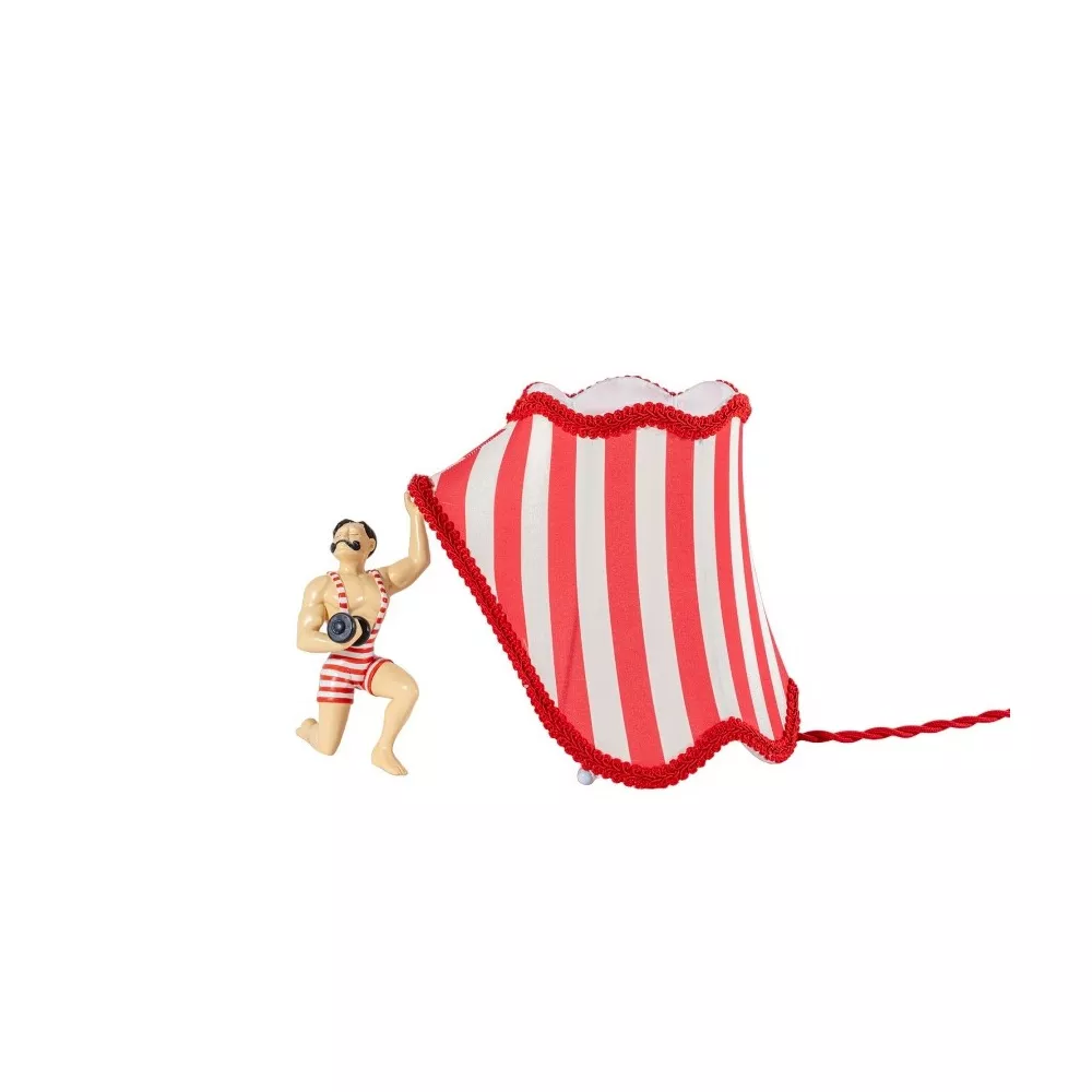 Lampada da tavolo Circus Abatjour Bruno Buffi personaggi ispirati al mondo del circo si trovano improvvisamente coinvolti in un equivoco comico. Accidentalmente scambiano un paralume per il loro tendone da circo e, desiderosi di esibire le proprie abilità e forza, sollevano un lembo della lampada/tenda, pronti per entrare in scena. Una serie di situazioni comiche segue questo errore, portando a situazioni esilaranti e incresciose. Design: Uto Balmoral Materiale: Resina/Metallo/ Poliestere Misure: 26 cm x h.19 cm | 10,2'' x h. 7,4''