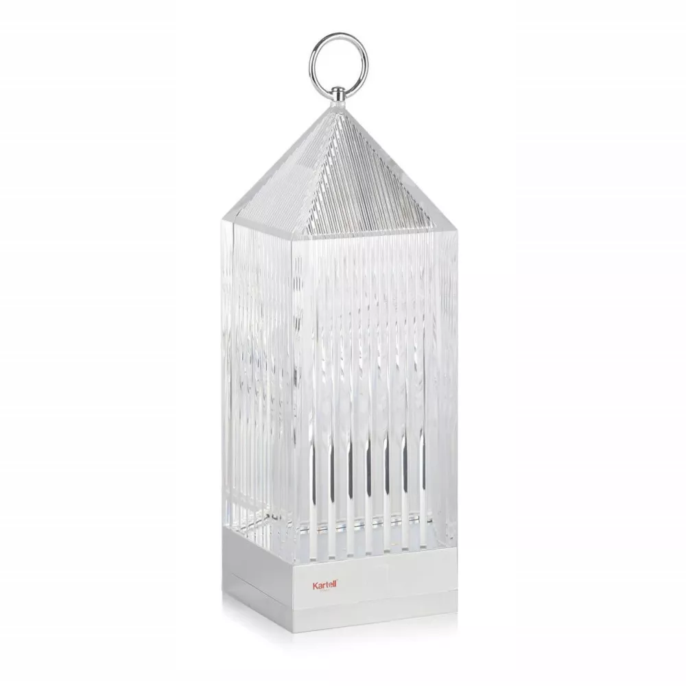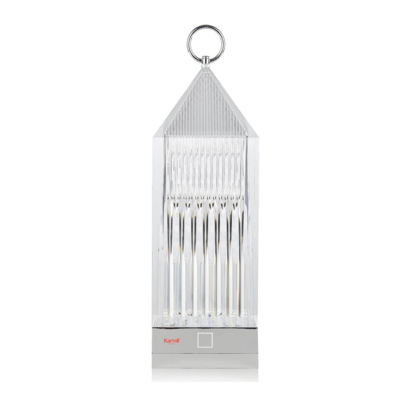 LAMPADA DA TAVOLO, LANTERN 9335 - KARTELL Kartell Lampada da tavolo Lantern by Fabio Novembre Lantern di Fabio Novembre è un’originale lampada a led portatile, una “lanterna ricaricabile” trasparente, stampata a iniezione, che si ricarica appoggiandosi a una base conduttrice. La luce viene proiettata grazie a un effetto grafico del design. Materiale Struttura: Tecnopolimero termoplastico Trasparente Dimensioni Larghezza: 9,5 cm Profondità: 9,5 cm Altezza: 31 cm Peso unitario: 0.8 kg